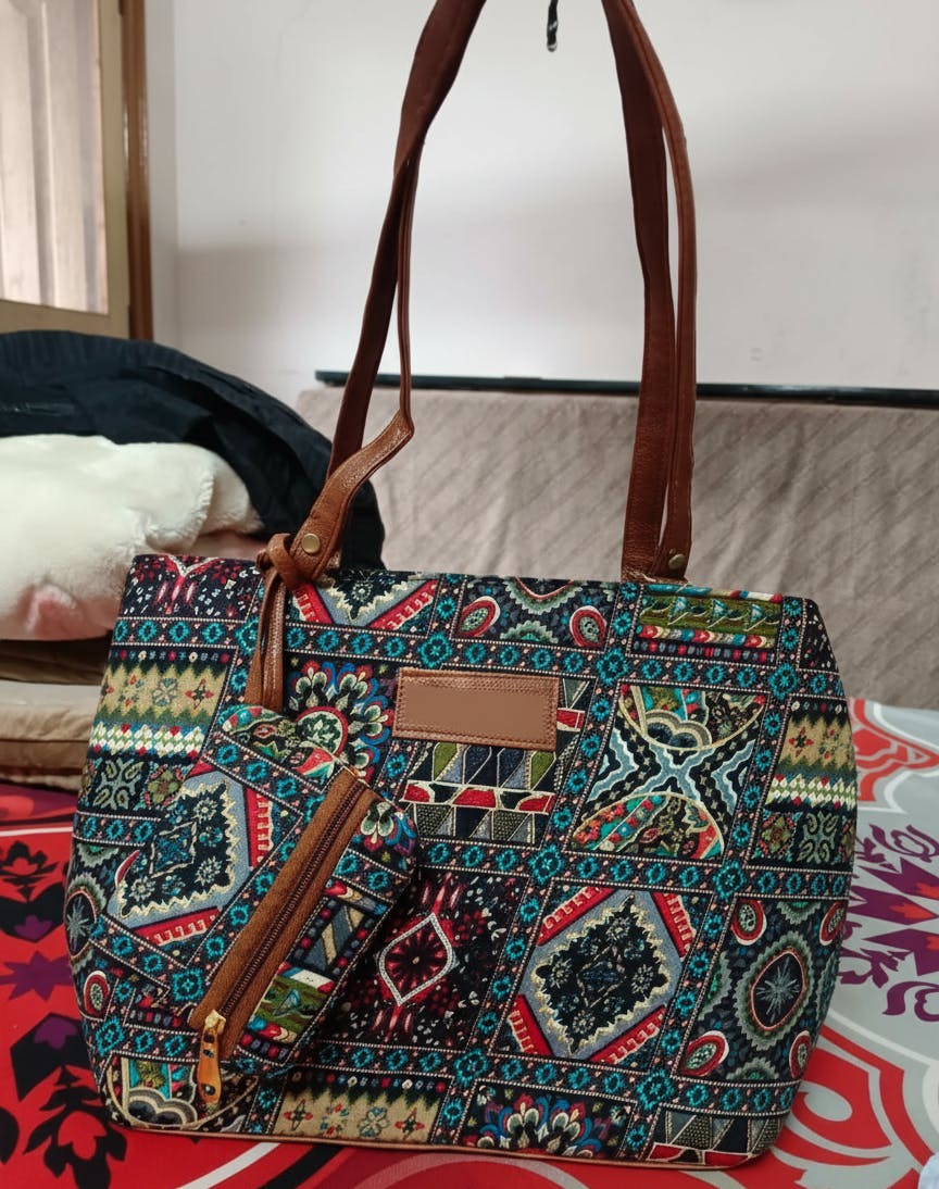 Indian Handmade Mirror Work Handbag For Upgrade your everyday look with this Women’s Embroidered Tote Bag, designed with premium leather handles and secure zip pockets for daily convenience.